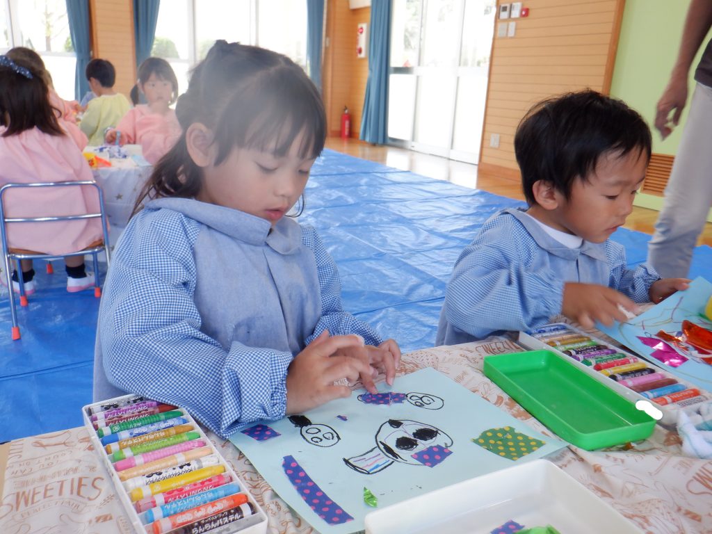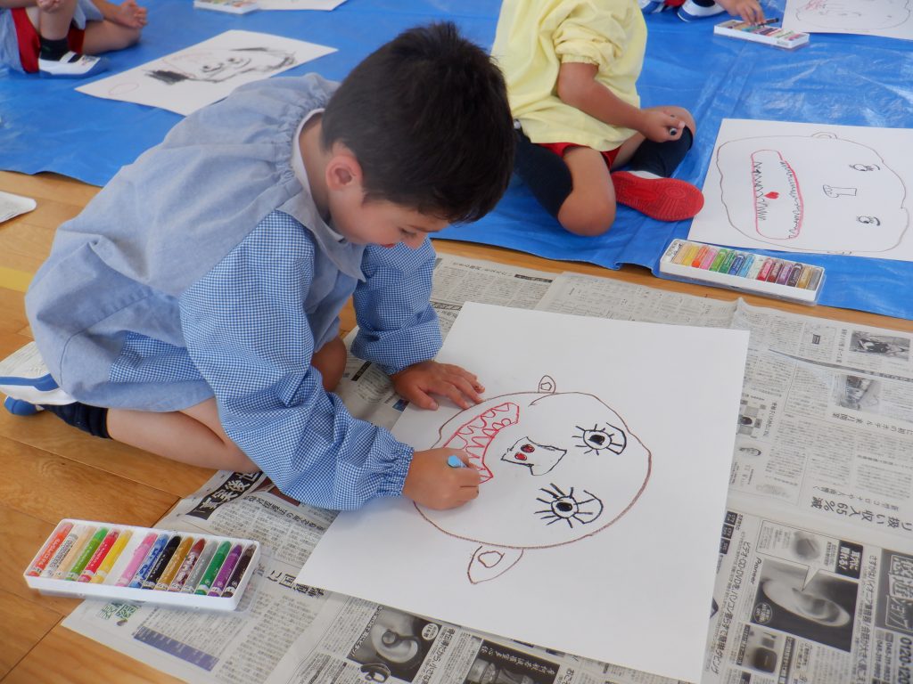 大きな画用紙に思い切り描く子どもたち・・・1学期に比べると、その子らしい表現がはっきりと見られるようになりました。
